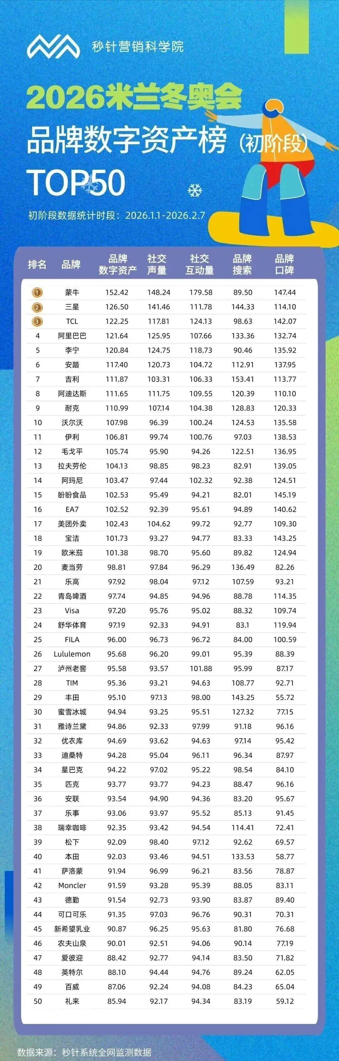 如何将IP的价值沉淀到品牌自己身上?相信很多品牌至今也无法回答这个问题,而站在今时今刻,看着这份在2月26日刚刚发布的《2026米兰冬奥品牌数字资产榜(终榜)》,人们惊喜地发现,蒙牛正在用自己的品牌力,为这个问题勾勒出了清晰的注解。